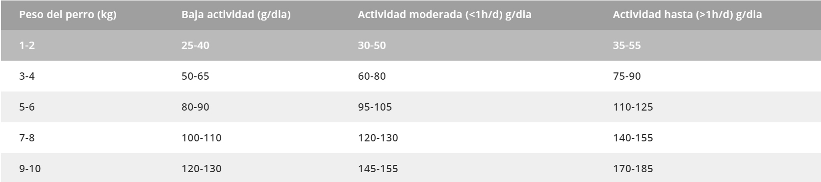 Las cantidades presentadas son orientativas y pueden variar según muchos factores. Ofrezca el alimento seco, en pote limpio, una o dos veces al día y mantenga siempre agua limpia y fresca cerca de su perro. Caso su perro aún no esté comiendo Biofresh recomendamos que la sustitución sea hecha de forma gradual, durante 4 hasta 5 días. Consulte regularmente al médico veterinario. Una taza de té (200ml) és equivalente a 90g de Biofresh.