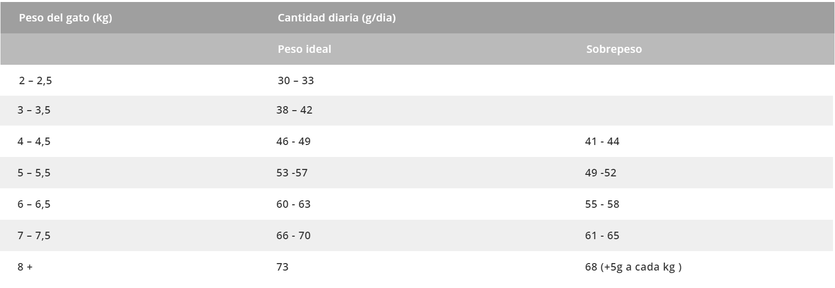Las cantidades presentadas son orientativas y pueden variar según muchos factores. Ofrezca el alimento en pote seco y limpio, varias veces al día y mantenga siempre agua limpia y fresca cerca de su gato. Caso su gato aún no esté comiendo Biofresh recomendamos que la sustitución sea hecha de forma gradual, durante 7 días. En caso de duda, consulte a un veterinario.