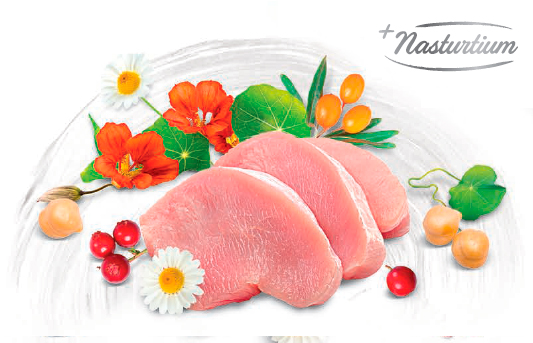 Pollo deshidratado (27%), pollo fresco carne (26%), guisantes amarillos (22%), manzanas secas (9%), aves grasa (conservada con tocoferoles, 4%), levadura de cerveza (3%), cáscara y semillas de psyllium (2%), aceite de salmón (2%), hidrolizado hígado de pollo (2%), linaza (1%), capuchina seca (0,5%), manzanilla seca (0,5%), minerales, espino amarillo seco (0,3%), arándanos secos (0,2%), fructooligosacáridos (0,015%), manano-oligosacáridos (0,015%), yuca de Mojave (0,008%), Lactobacillus acidophilus HA - 122 inactivado (15x109 células / kg).