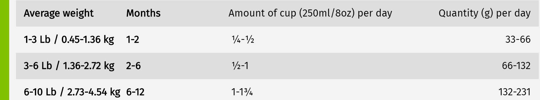 Proteína bruta min 30.00% Grasa bruta mínima 16.00% Fibra bruta max 3.00% Humedad máx. 10.00% Ceniza máxima 7.00% Calcio min 1.00% Fósforo min 0.80% Magnesio max 0.11% Potasio min 0.60% Sodio min 0.20% Omega-6 * ácidos grasos min 2.80% Omega-3 * ácidos grasos min 1.00% Glucosamina * min 100 mg / kg Condroitín sulfato * min 100 mg / kg