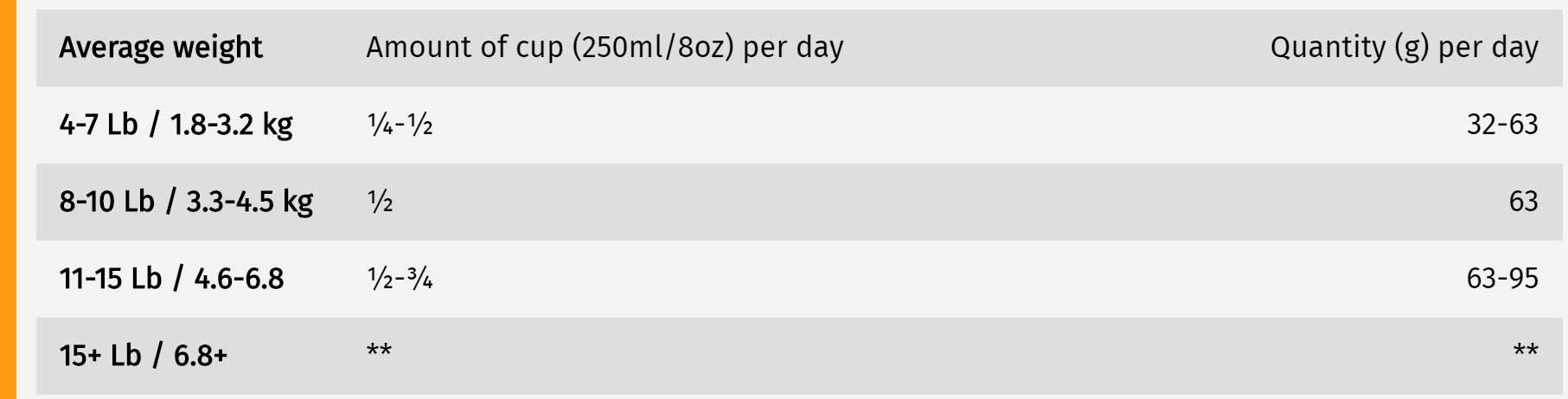 La energía metabolizable calculada es 3460 kcal / kg, 436 kcal / taza de 250 ml.