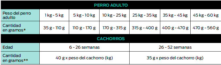 ** La cantidad para cachorros debe considerar el peso real del perro y su edad. Dividir la cantidad total a ser ofrecida en por lo menos dos raciones.