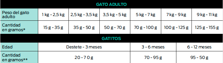 ** A partir de la tercera semana los gatitos pueden comer una ración humedecida con agua. Agregue 1 parte de agua por cada 3 partes de producto y reduzca gradualmente la cantidad de agua hasta que esté comiendo el alimento completamente seco. En caso de que el alimento sea humedecido desechar la porción no consumida. Dividir la cantidad diaria por lo menos en 4 comidas.